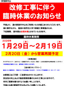 道の駅望羊中山より、改修工事実施に伴う臨時休業のお知らせです。